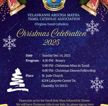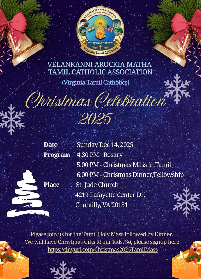 Please join us for the Tamil Holy Mass followed by Dinner. We will have Christmas Gifts for our kids. So, please signup here and provide the headcount with appropriate age range: https://tinyurl.com/Christmas2025TamilMass
